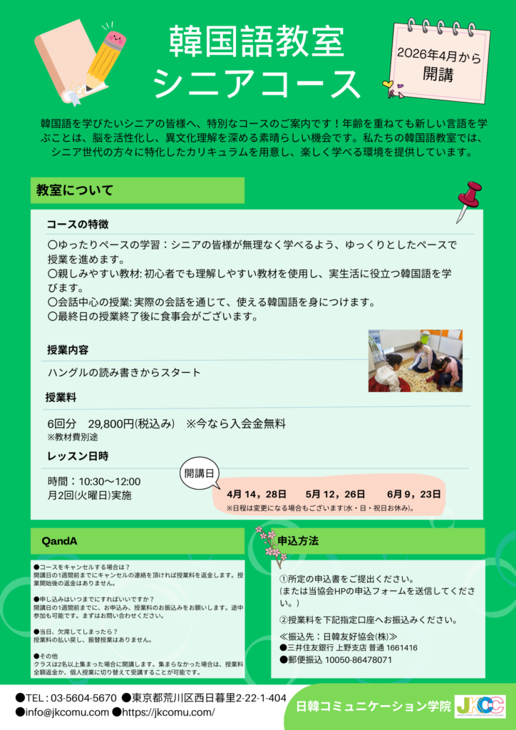 特別なコースのご案内です!年齢を重ねても新しい言語を学ぶことは、脳を活性化し、異文化理解を深める素晴らしい機会です。私たちの韓国語教室では、シニア世代の方々に特化したカリキュラムを用意し、楽しく学べる環境を提供しています。